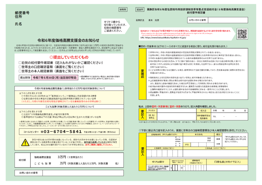 ※下のお知らせのどちらかが届いた方はこちらの申請は必要ありません。(令和6年1月1日以前より葛飾区にお住まいの方で、対象の世帯にお知らせを送付しています。)